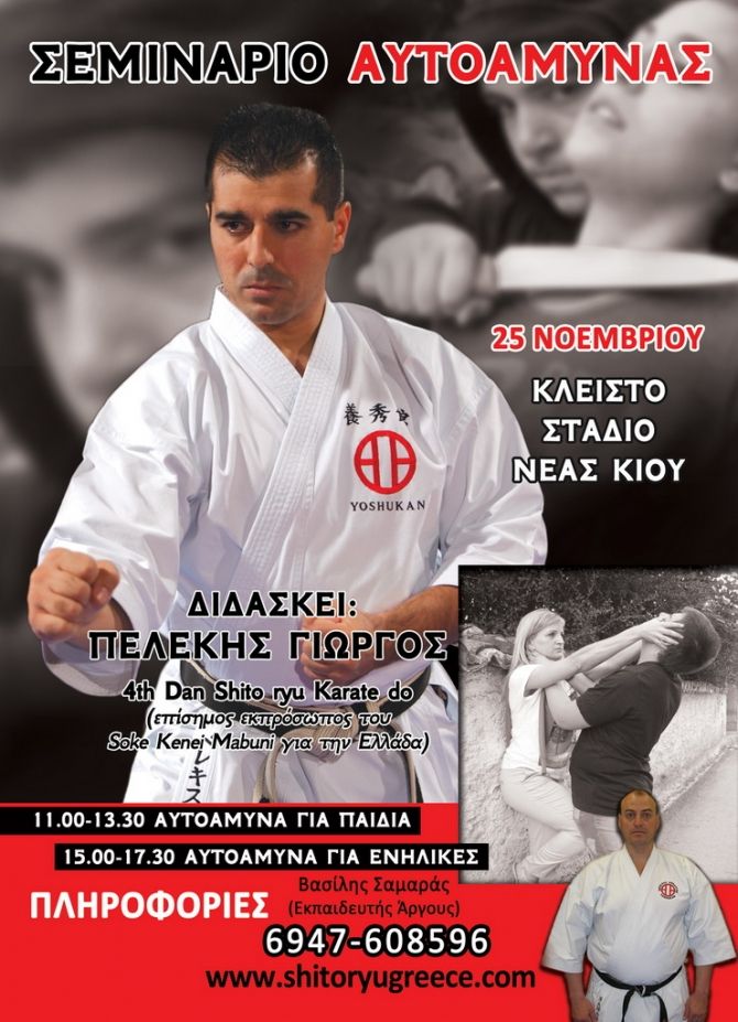 A seminar regarding self defense has been organized by “Yoshukan Dojo” branch of Argos city and its instructor Sensei Vasilis Samaras with numerous participation and great success, on November 2, 2012, located at the Close Stadium of Nea Kios district.