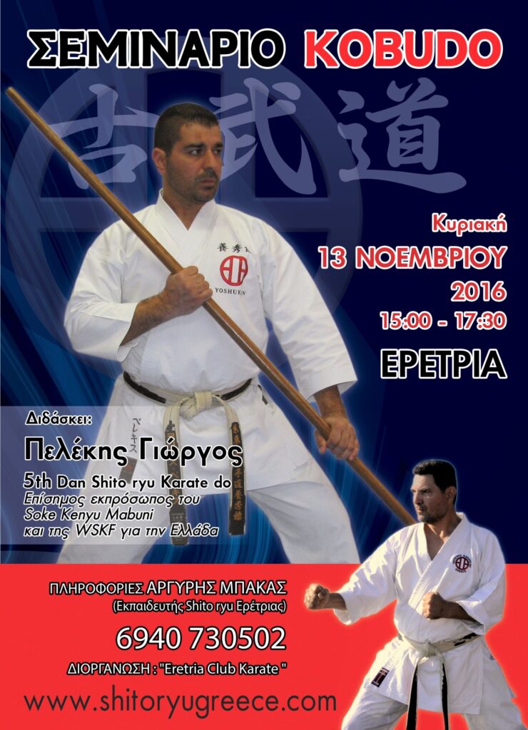 Την Κυριακή 13 Νοεμβρίου 2016 πραγματοποιήθηκε σεμινάριο Kobudo (Παραδοσιακά όπλα) που διοργάνωσε ο Αθλητικός Σύλλογος Καράτε Ερέτριας με προπονητή τον Αργύρη Μπάκα.