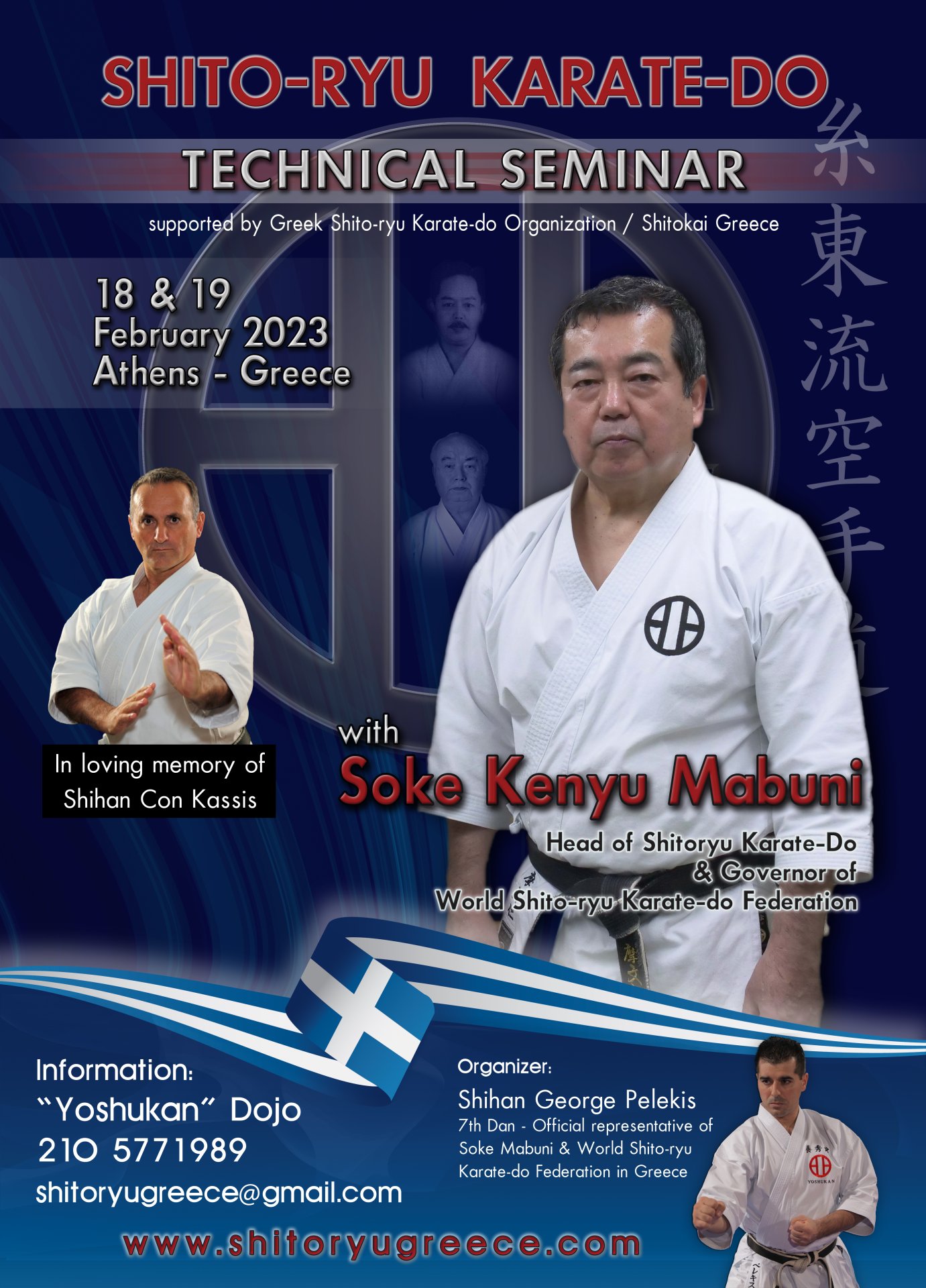 Κοινοποίηση άρθρου: Shitoryu Karate-Do Technical Seminar with Soke Kenyu Mabuni in Athens 18 & 19/02/2023 09:00 Athens Olympic Sports Center The global Leader and successor of Shitoryu Karate-Do will teach in Greece!!! Κοινοποίηση άρθρου: