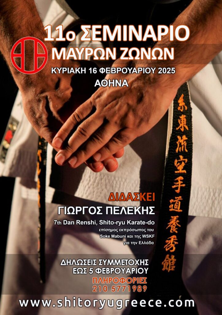 Ο λόγος για το “11ο Σεμινάριο Μαύρων ζωνών” που επανήλθε δυναμικά και απευθύνεται σε κατόχους Μαύρης ζώνης και Νταν και στο οποίο για μία ακόμη φορά δίδαξε ο Τεχνικός Υπεύθυνος του συλλόγου και εκπρόσωπος της Παγκόσμιας Ομοσπονδίας Shito-ryu, Γιώργος Πελέκης.